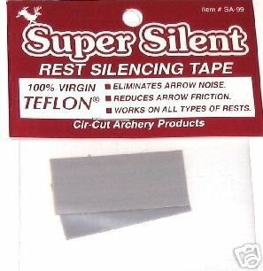 Virgin Teflon Super Silent Arrow Rest Silencing TapeSuper Silent Teflon Arrow Rest Silencing Tape, 100 % virgin adhesive backed teflon tape, the ultimate solution to arrow rest noise. Simply adhere to rest at arrow contact points and trim to shape. Color: Natural Teflon, THICKNESS ( .015 ) 2 PCS. 3/4" WIDE X 1.5" LONG PER PACK , CIR CUT ITEM # SA-991. This page is a participant in the Amazon Services LLC Associates Program, an affiliate advertising program designed to provide a means for sites to earn advertising fees by advertising and linking to amazon.com